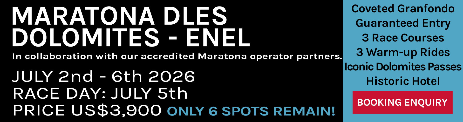 Join us for 3 incredible guided warm up rides in the heart of the Dolomites followed by Race Day on the 5th July 2026.