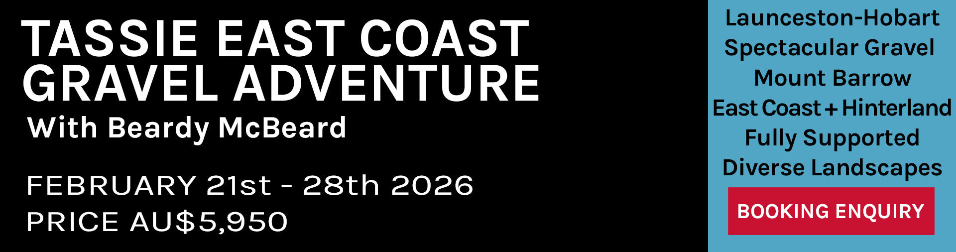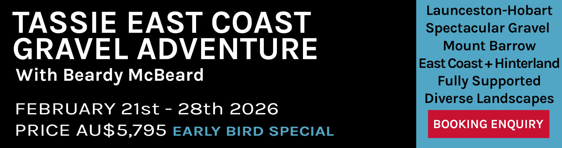 Embark on an inspiring 8-day, 7-night gravel cycling adventure along Tasmania's East Coast and hinterland, experiencing some of the Island State's best cycling. Starting in Launceston and finishing in Hobart, this fully supported 450km tour offers challenging climbs, rugged forests, farmlands, wild coastlines, pristine beaches, and charming seaside towns. Guided by professional cycling photographer Beardy McBeard, riders will enjoy stunning scenery, varied terrain, and the iconic climb of Mt Barrow. With unique luxury accommodation, daily luggage transfers, and memorable culinary experiences, this adventure is perfect for those seeking to create lasting memories both on and off the bike.