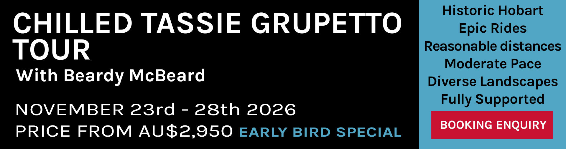 Led by renowned cycling photographer and local guide Beardy McBeard, you’ll experience a curated collection of Tasmania’s finest routes—including the iconic ascent of Mt Wellington and Bruny Island.